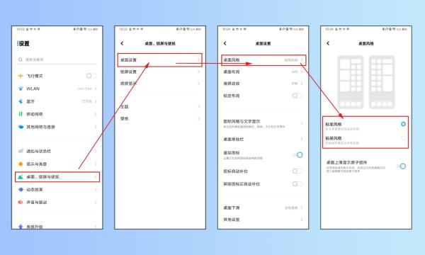 1、标准风格:桌面会显示所有软件的图标,桌面左右滑动页面可以找到相应软件。