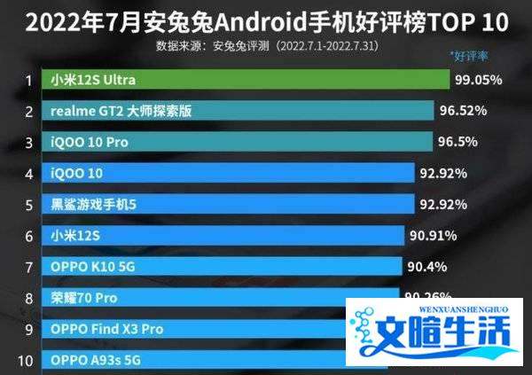 2022年7月Android手机好评榜中,排名前三的机型分别为小米12S Ultra、realme GT2大师探索版、iQOO 10 Pro,此外还有多款机型进入榜单前十,以下为具体推荐信息: