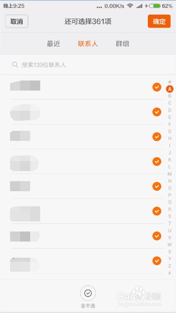 第五步,点击确定。从联系人当中选取或者全选。