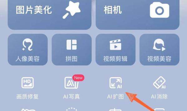 一、AI扩图功能入口打开美图秀秀APP进入主页面,在底部菜单栏直接点击【AI扩图】选项即可进入功能界面。