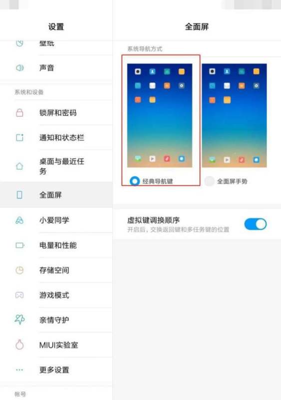 切换导航模式:在全面屏设置界面中,选择“经典导航键”选项,系统将自动应用并显示传统三键导航栏。