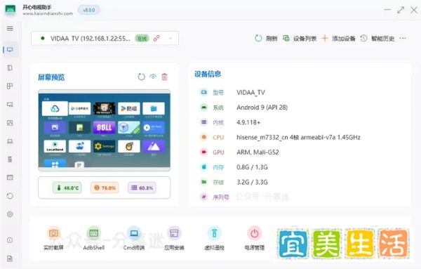 一、核心功能图形化操作界面:专为小白用户设计,无需复杂命令即可完成智能电视、机顶盒、投影仪等设备的系统管理,包括应用安装、广告去除、系统优化等操作。